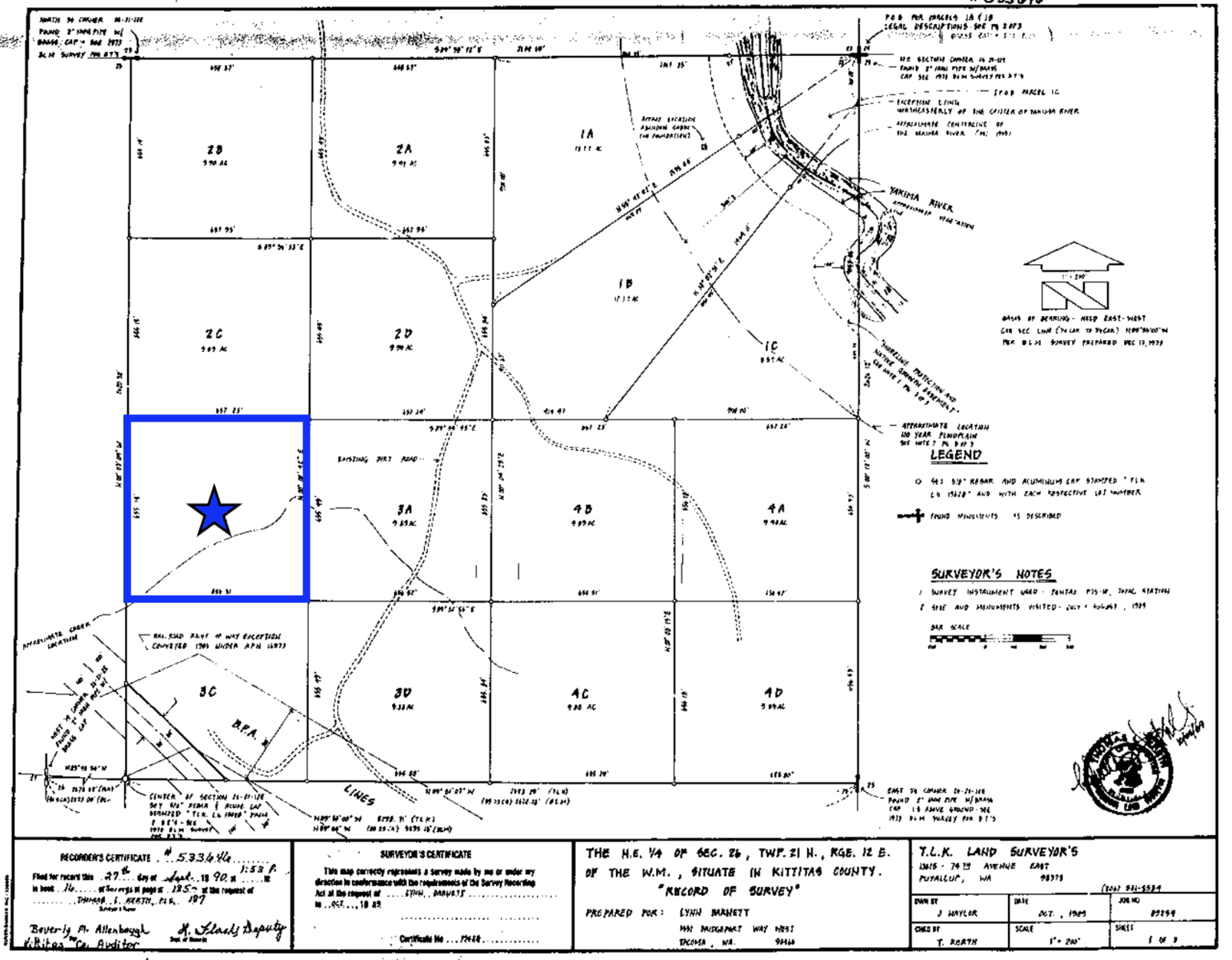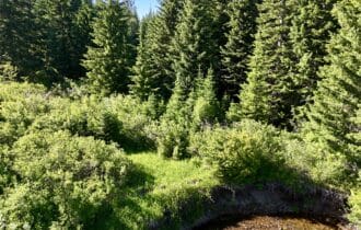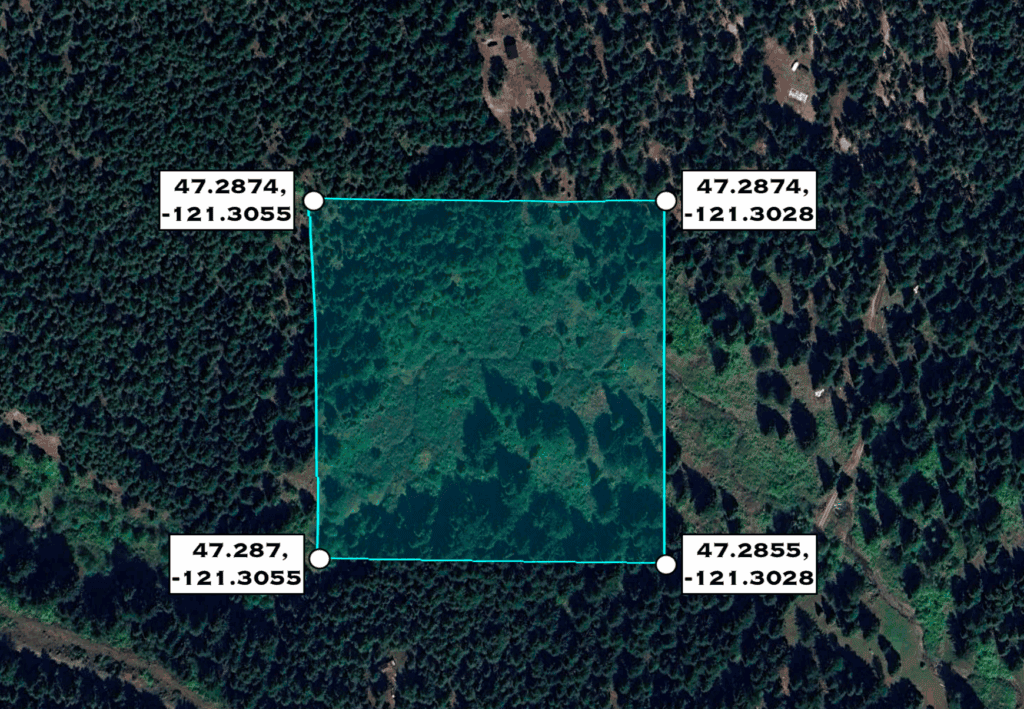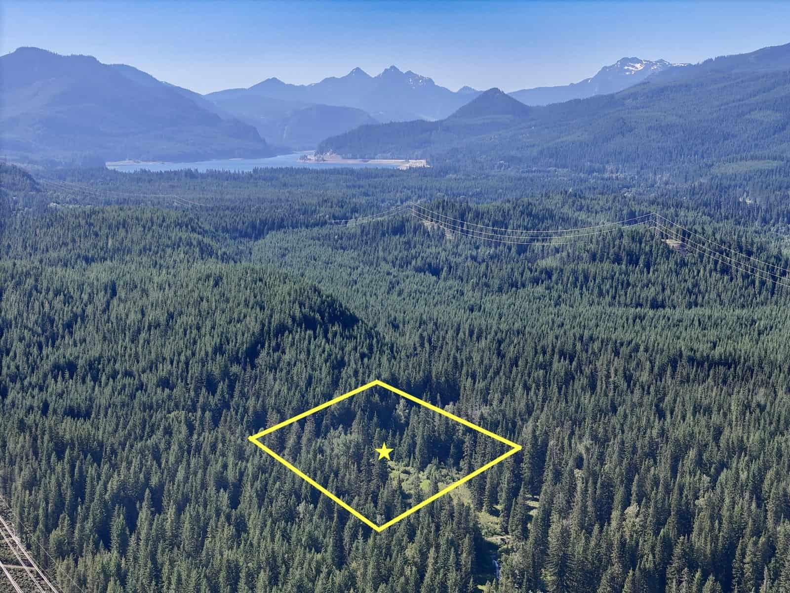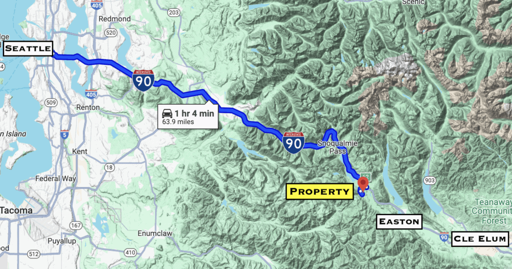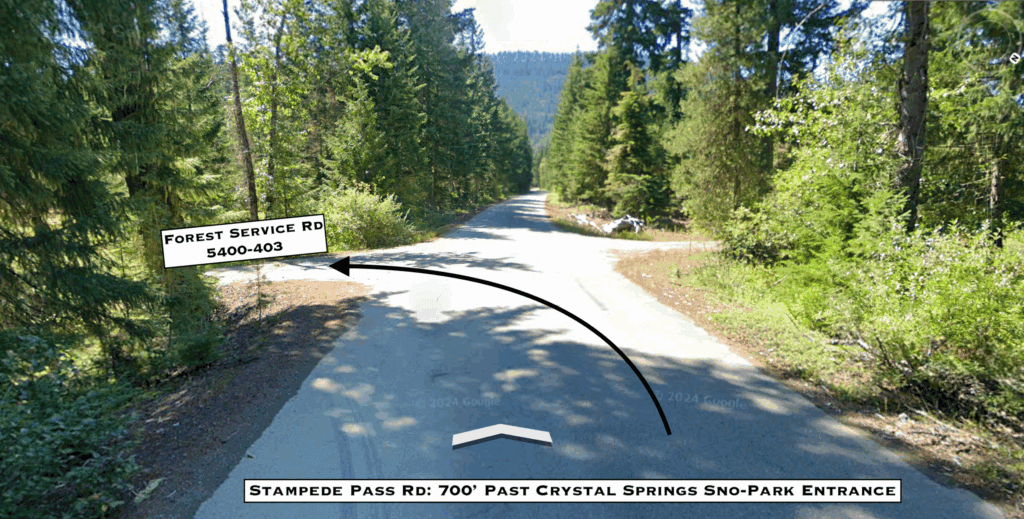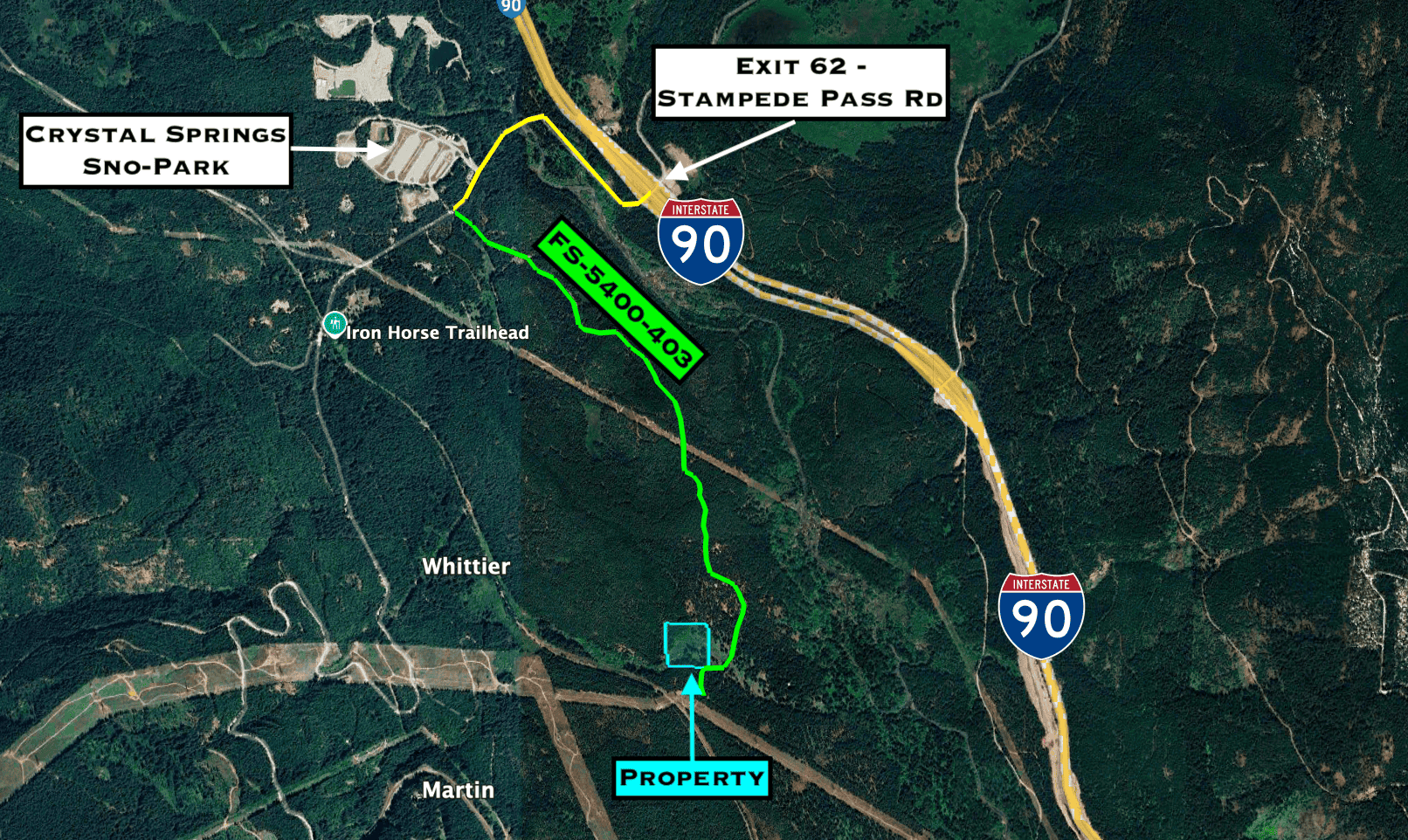 I-90 to Exit 62 – Stampede Pass. Take Stampede Pass Rd south. In ¾ mile you’ll pass the Crystal Spring Sno-Park entrance on your right. 700 feet further, take a left onto Forest Rd 5400-403. Follow the road 1.75 miles to the property. Put in coordinates 47.28581, -121.30158 which is a good landmark where Stampede Creek crosses under the road. From here, the property is to your west. Use our GPS coordinates for guidance.