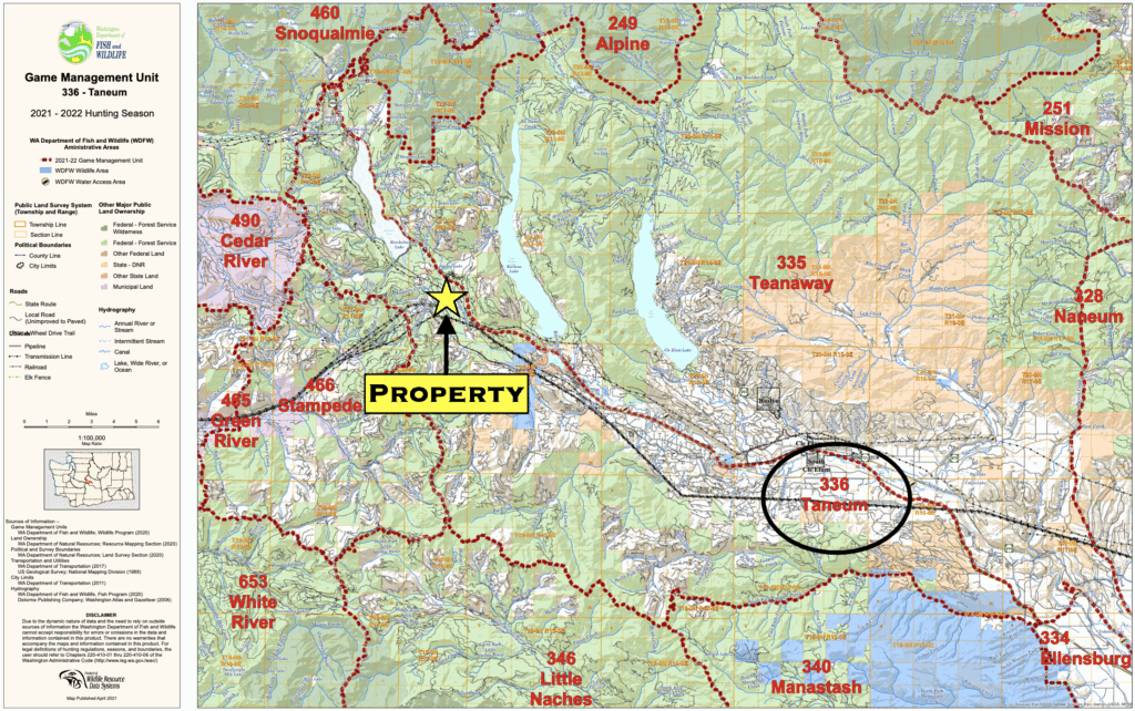 Access to the outdoors is what really sets this parcel apart. Within walking distance is the Palouse to Cascades trail – offering 350+ miles of hiking, biking, and backcountry exploration. Also within walking distance is the Yakima River, offering rafting, kayaking, and fishing opportunities. Less than two miles away is the Crystal Springs Sno-Park – the largest of it’s kind in the state, offering access to another 50+ miles of groomed snow trails right from your doorstep. In addition to the numerous mountain peaks, the three main lakes of the area: Keechelus Lake, Kachess Lake, and Cle Elum Lake are all short drives away. Elk, deer, black bear are all prevalent in the area.