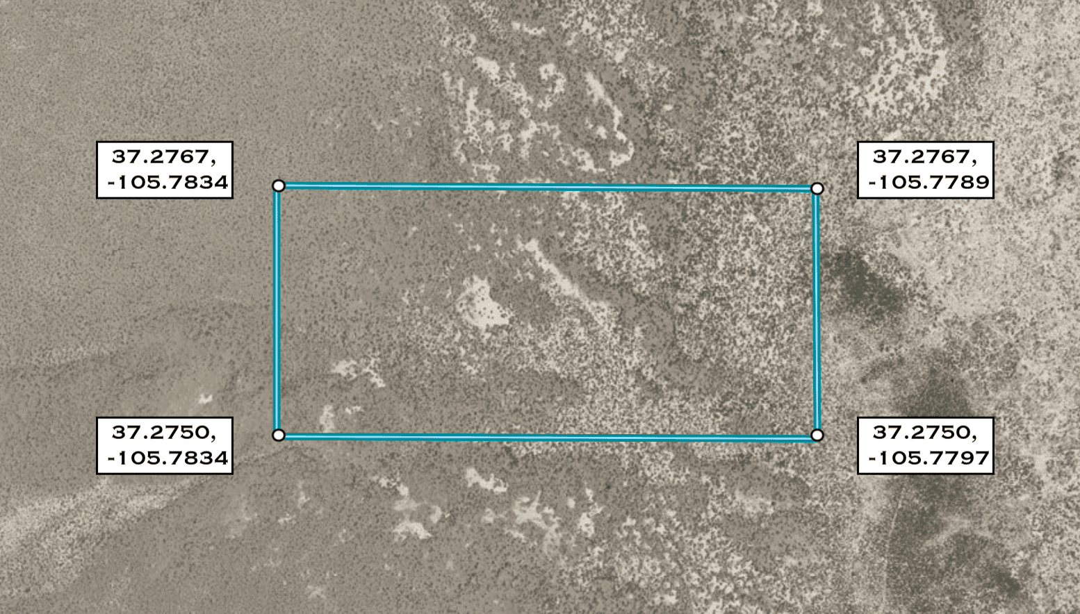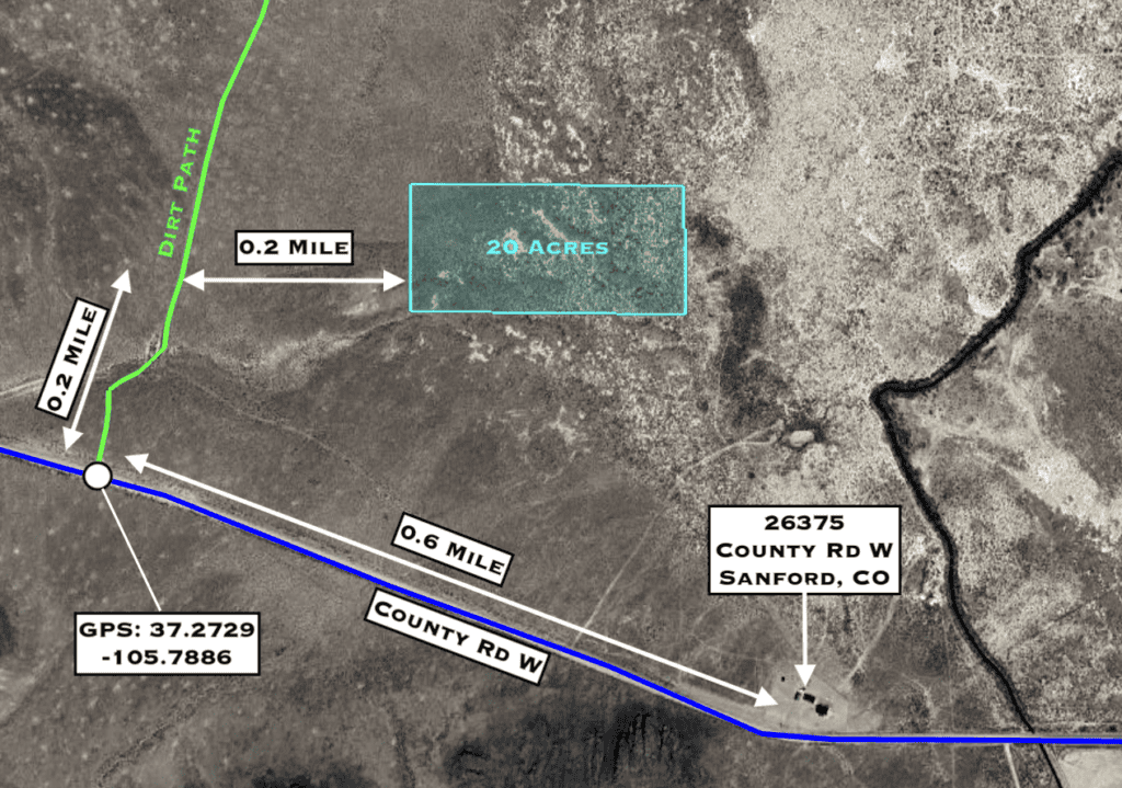 Use 26375 County Road W, Sanford, CO 81151, which is the nearest address. From that address, go west on County Road W for 2/3 mile and turn north onto the two-track dirt path at GPS: 37.2729, -105.7886. Follow the path north for 0.2 miles. From this point, the property’s west boundary is 0.2 mile to the east. Use our maps and GPS coordinates for guidance.