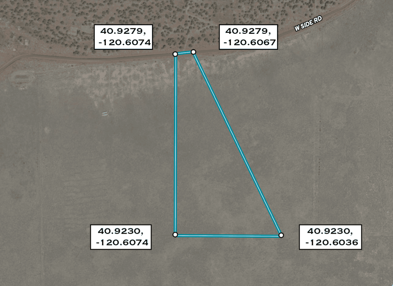 Use 533-575 West Side Rd, Termo, CA. The 24.4 acres is across the road from the driveway and gate to this address.