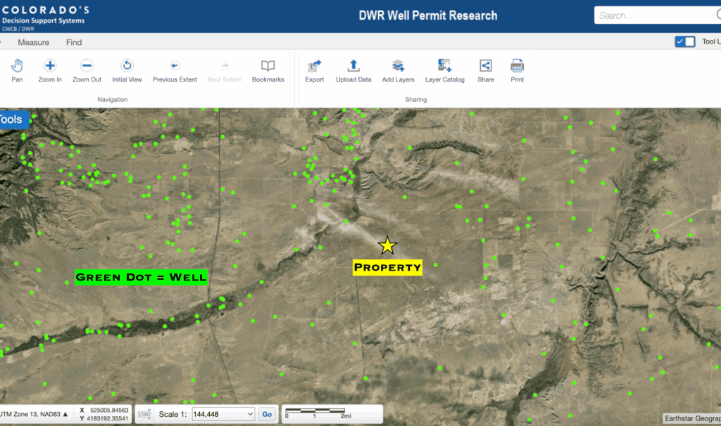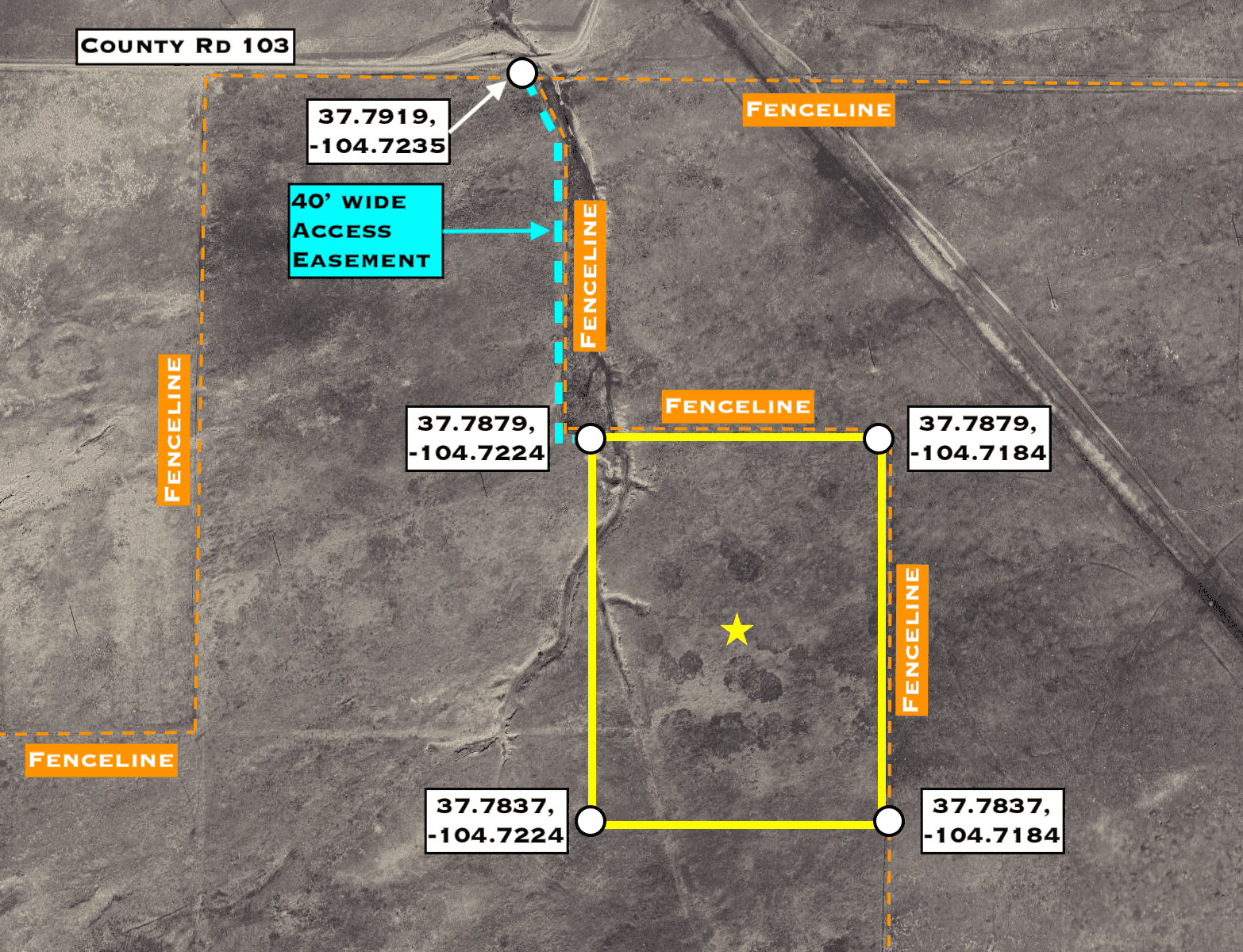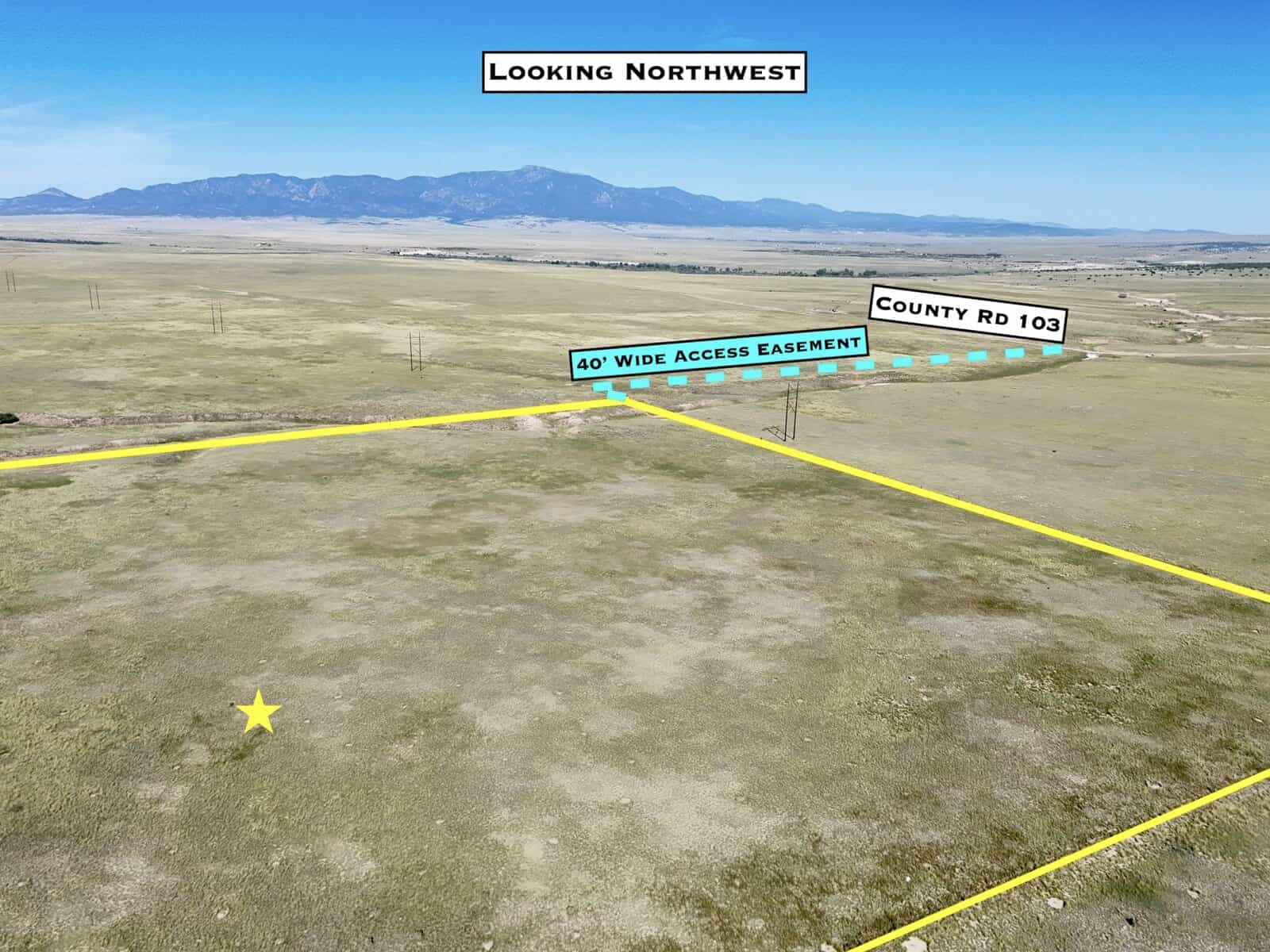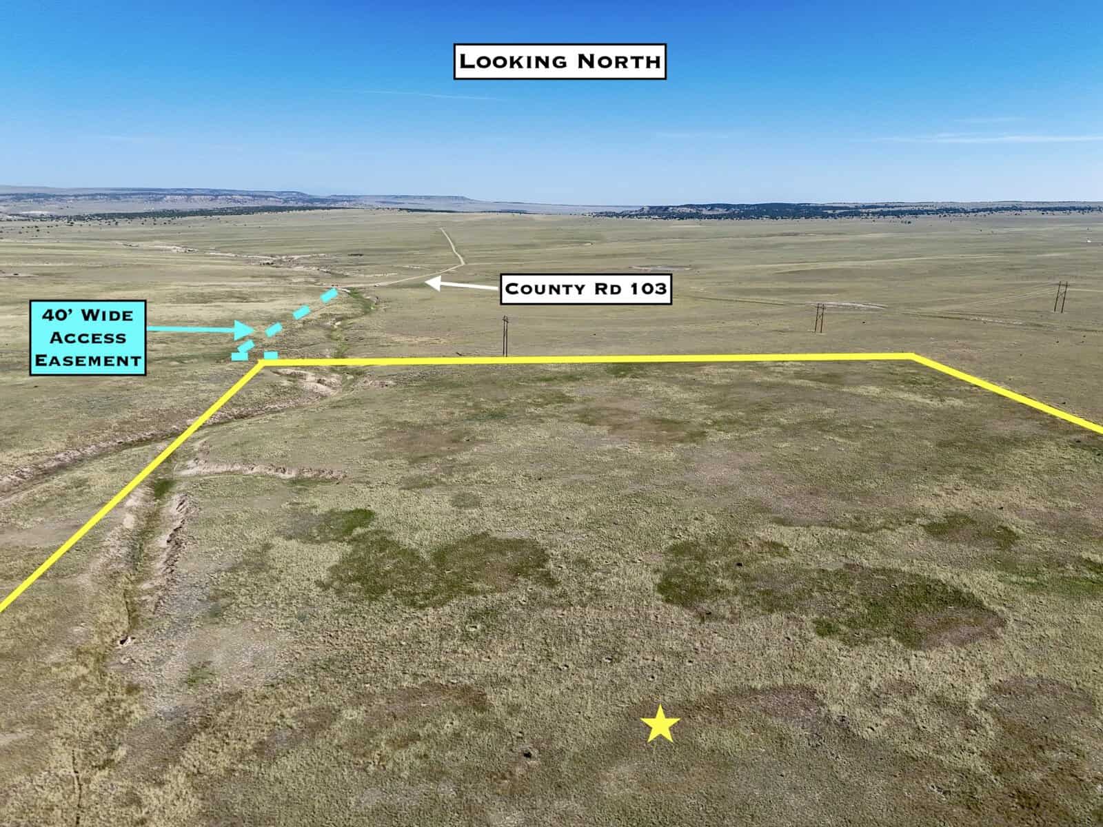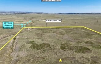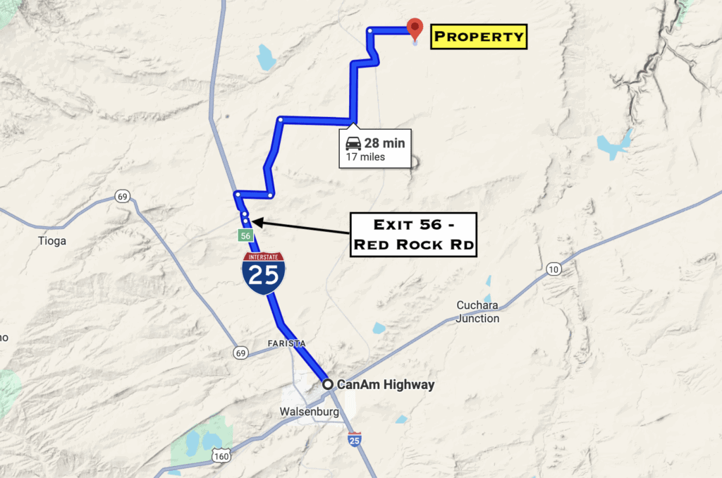 Directions: From I-25, take Exit 56 for Redrock Rd. At the off-ramp turn east and then take the immediate left to go north on County Road 102 parallel to the highway. In 4 miles turn right onto County Road 103. In 7 miles the property will be to your right. Use our maps and GPS coordinates for guidance.