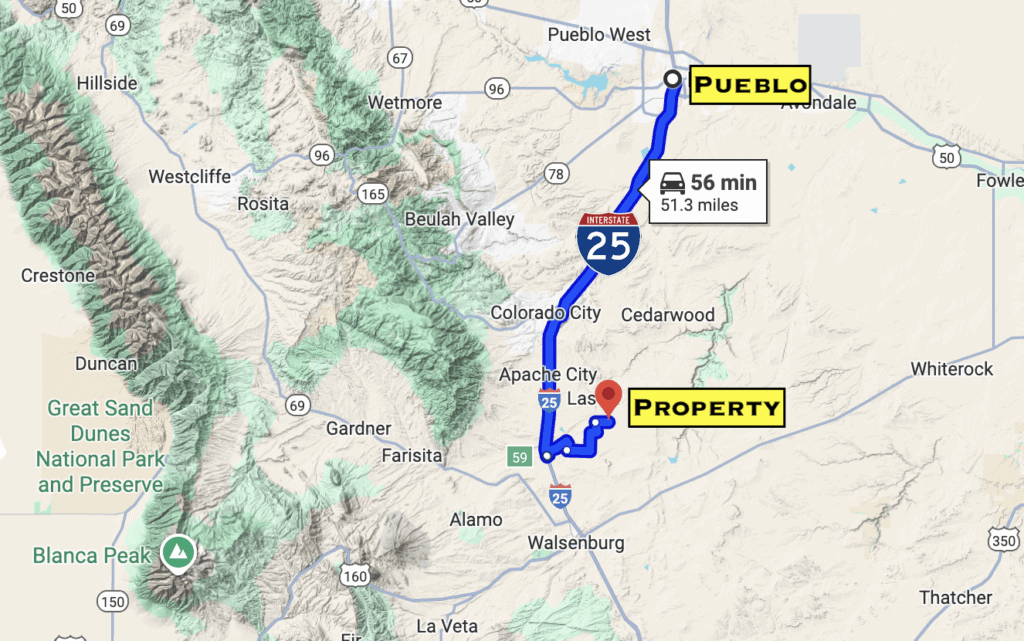 Nearest Town: 30 minutes to Walsenburg (Pop. 3,100). Walsenburg has all the necessary amenities including a supermarket, restaurants, service stations, hardware stores, schools, and hospitals. Big Box retailers can be found 45 minutes away in Trinidad (Pop. 8,200) to the south and Pueblo (Pop. 168,000) to the north.