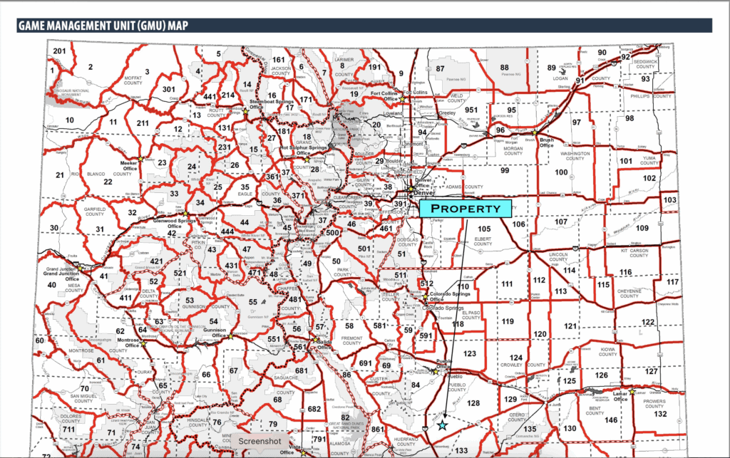 Hunting: GMU 128. More info can be found in this document. https://cpw.widencollective.com/assets/share/asset/erjzbk48be