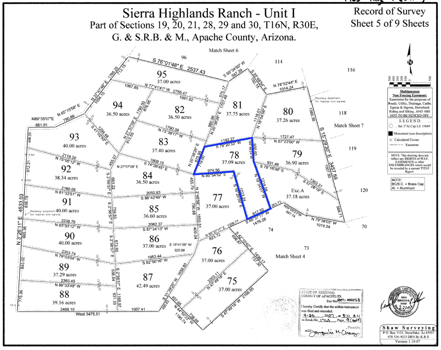 37.09 acres (Lot #78) in northern Arizona’s Sierra Highlands Ranch with maintained road access and a community well. Residential, recreational, and agricultural uses are all permitted. The terrain is relatively level for easy building. Choose to drill a well or use the community well to haul water to your property. Pricing far below comps in the ranch.