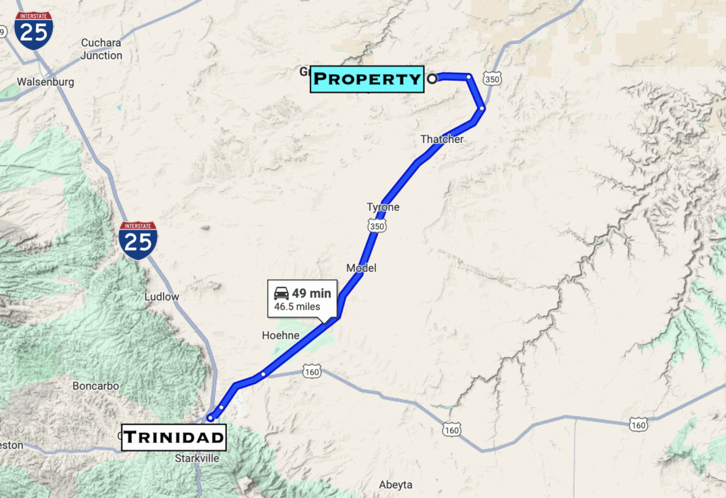 Nearest Town: 45 min to Trinidad (population 8,000). It has all the regional-city amenities expected, including groceries, restaurants, gas, hardware supply stores, and a Walmart Supercenter