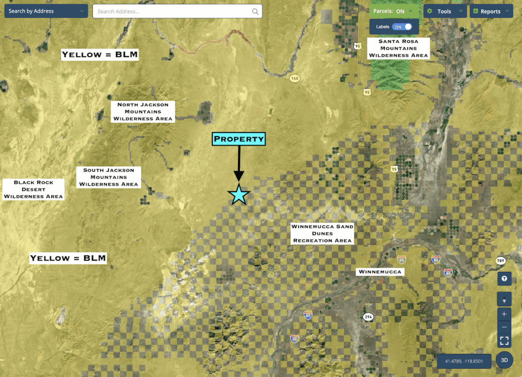 The property is situated in a valley between the Jackson Mountains to the west, the Slumbering Hills to the east, and Blue Mountain to the south. There is contiguous BLM lands extending all the way from the property easement to and beyond Jackson Mountains via BLM roads and jeep trails. Located in GMU 035, this would be an excellent property for a hunting base camp adjacent to the Jackson Mountain public lands. The Winnemucca Sand Dunes are also just a few miles to the southeast from the property and can be accessed via BLM roads and jeep trails.