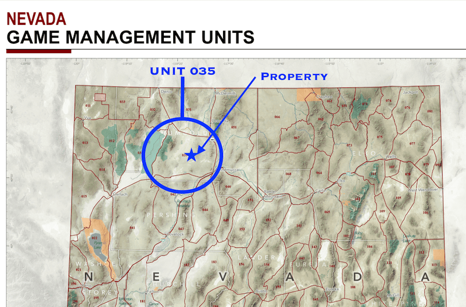 The property is within Game Management Unit 035 which includes the Jackson Mountain wilderness. This is an excellent unit if you want easy access to the vast public lands in the area.