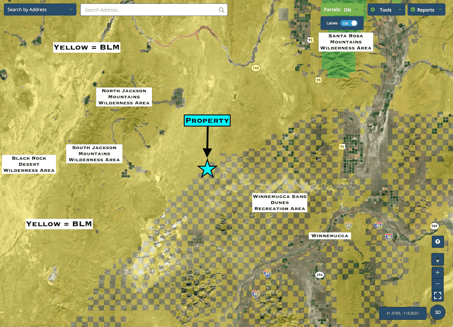 The property is situated in a valley between the Jackson Mountains to the west, the Slumbering Hills to the east, and Blue Mountain to the south. There is contiguous BLM lands extending all the way from the property easement to and beyond Jackson Mountains via BLM roads and jeep trails. Located in GMU 035, this would be an excellent property for a hunting base camp adjacent to the Jackson Mountain public lands. The Winnemucca Sand Dunes are also just a few miles to the southeast from the property and can be accessed via BLM roads and jeep trails.