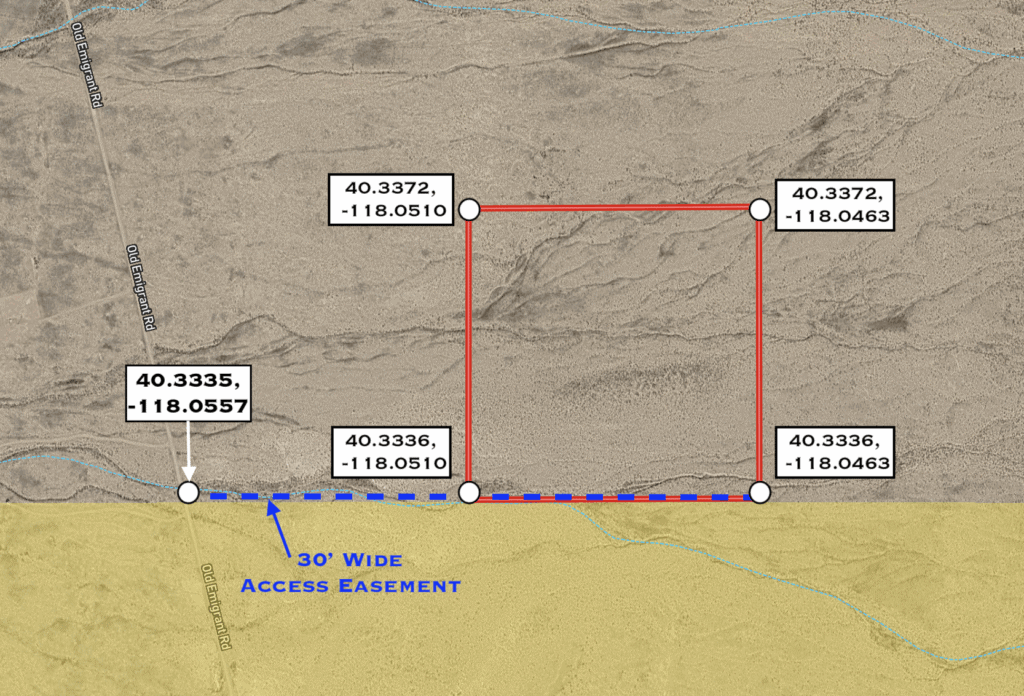 Directions from the North (Winnemucca): Take I-80 south to Exit 149 (Mill City). At the end of the ramp, turn left (south) onto NV Route 400. In 23 miles turn left onto Buffalo Springs Rd (aka Buena Vista Valley Rd). Go 1.9 miles to GPS coordinates: 40.3335, -118.0557. From this point, there’s a 30 ft wide access easement from the road east to the property. Use our maps and GPS coordinates for guidance.
