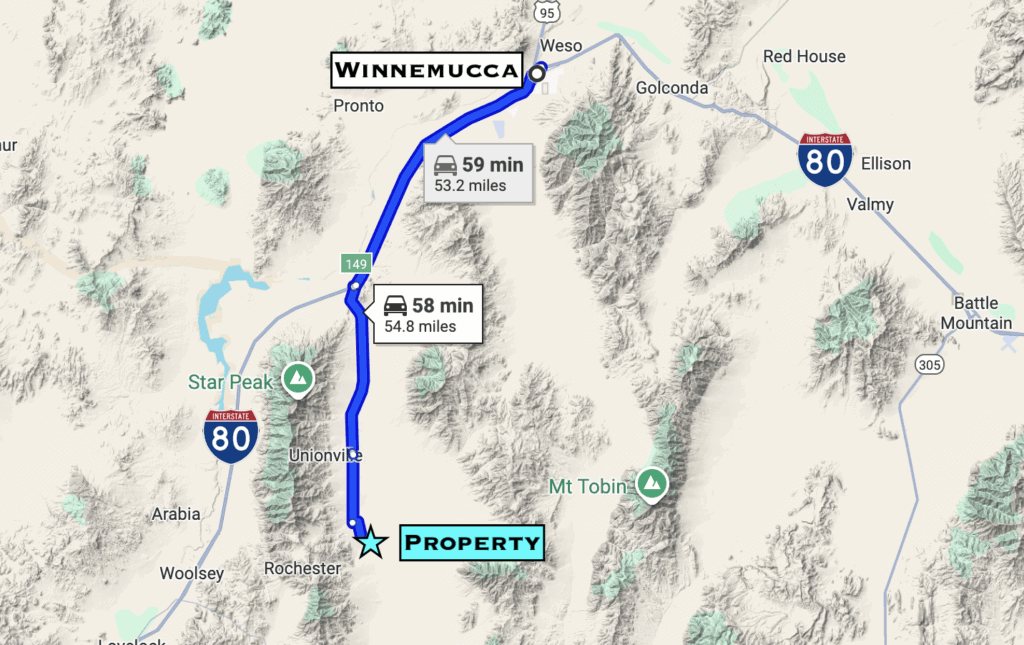 Directions from the South (Lovelock): Take I-80 north to Exit 119 (Oreana/Rochester). At the end of the ramp, turn right (east) onto Lovelock-Unionville Rd. In 15 miles turn right onto Buffalo Springs Rd (aka Buena Vista Valley Rd). Go 1.9 miles to GPS coordinates: 40.3335, -118.0557. From this point, there’s a 30 ft wide access easement from the road east to the property. Use our maps and GPS coordinates for guidance.