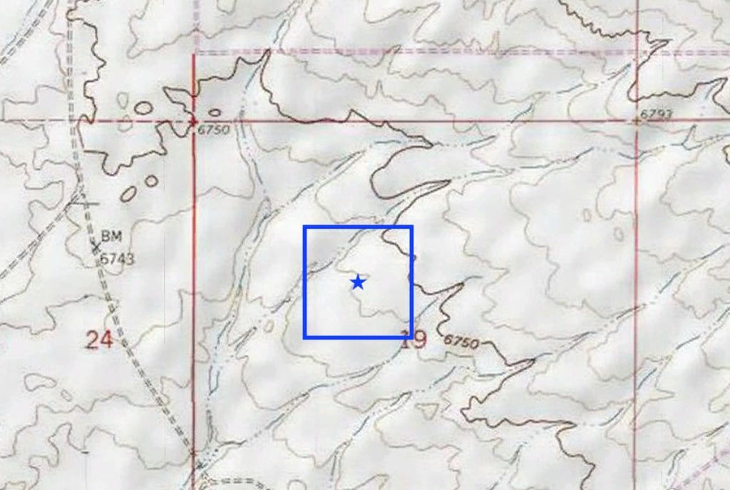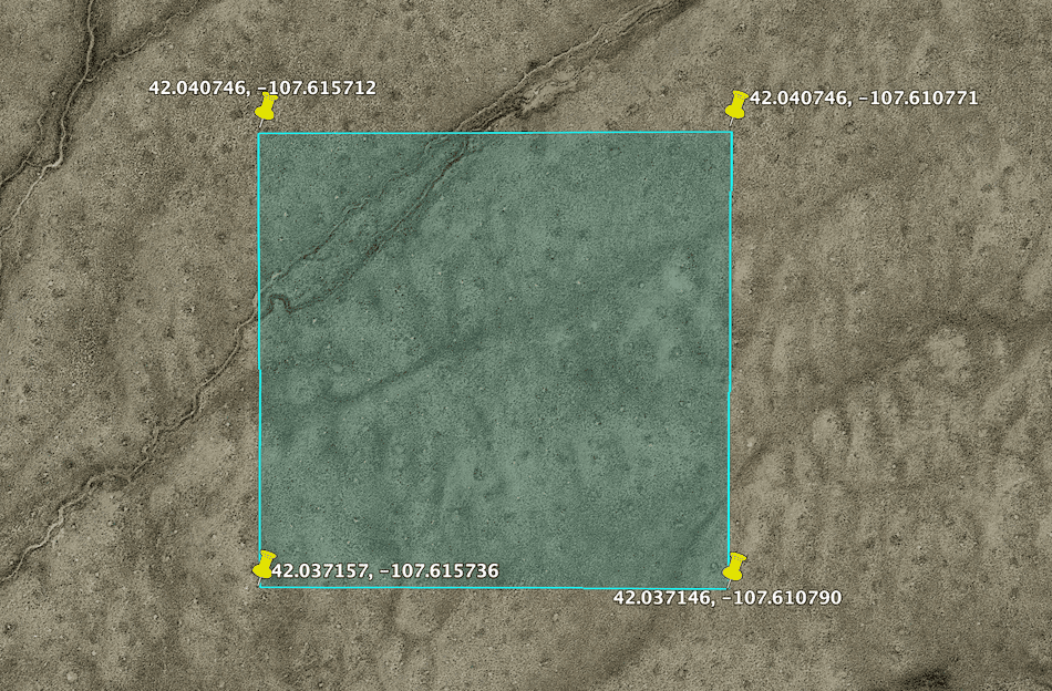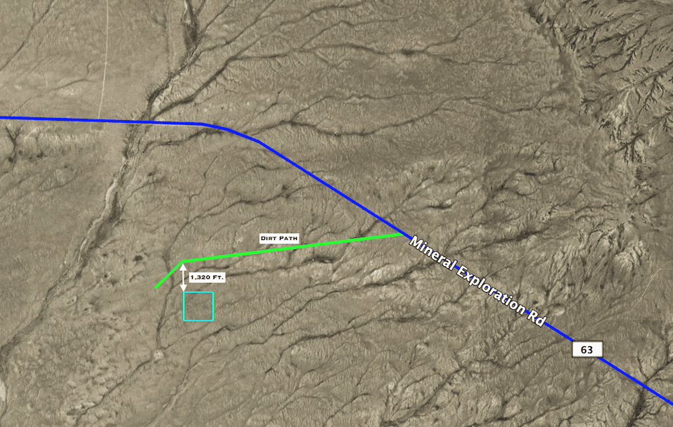 Alternatively, there is another, more direct path to the property that leads to the SE side of the property. In 12.75 miles, turn left onto a dirt path at GPS 42.045946, -107.575446. Follow the path southwest for 0.9 miles and turn right to head west. In 0.6 miles, you will hit the property.