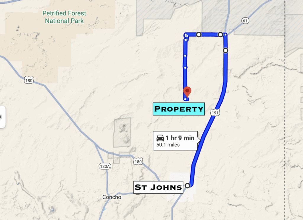 Nearest Town: 1 hr 15 min to St. Johns (population 3,300). St. Johns has all the small-town amenities expected, including groceries, restaurants, gas, and hardware supply stores.