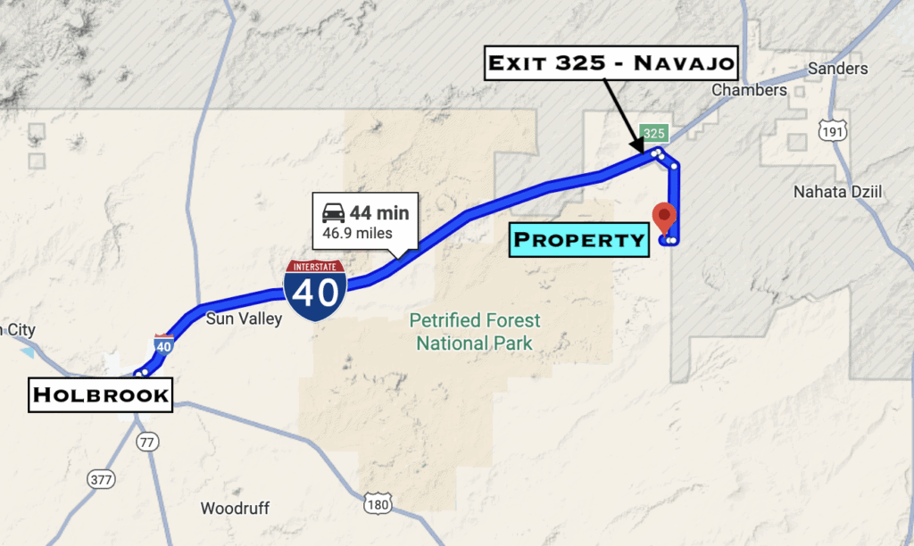 Nearest Town: 45 minutes to Holbrook (Population 5,000). Holbrook has all the services of a regional town including food markets, restaurants, hotels, gas, hardware stores, and a Walmart.
