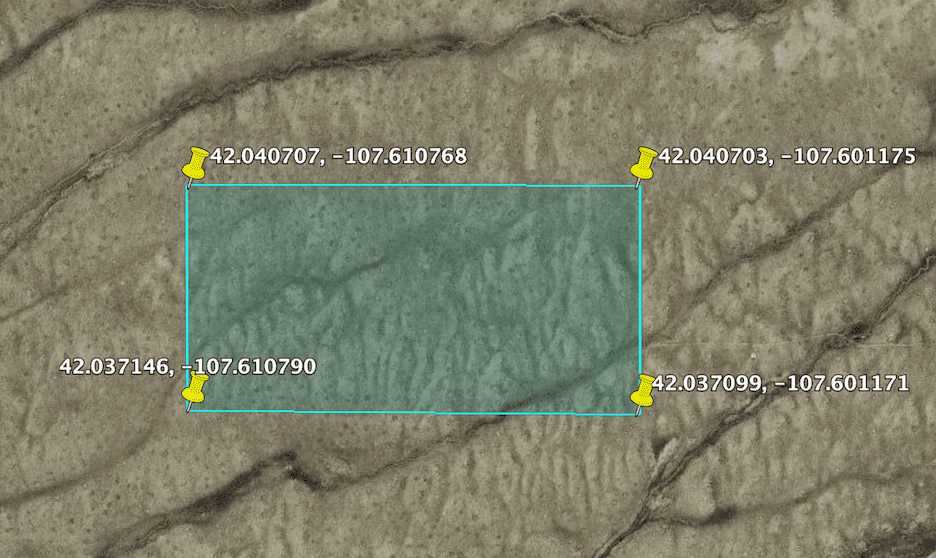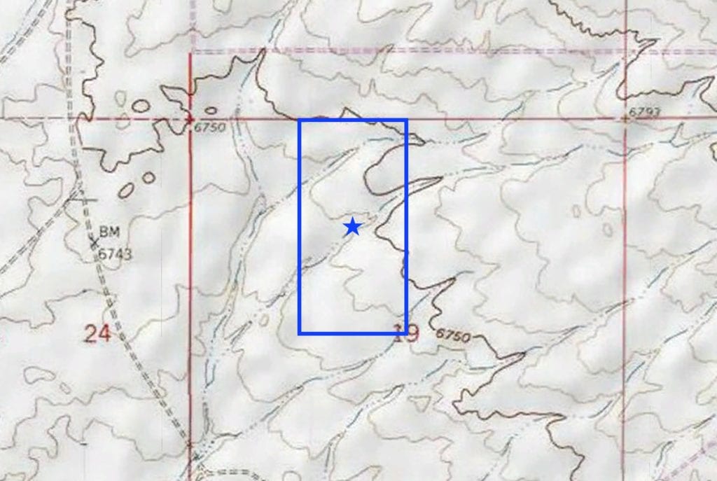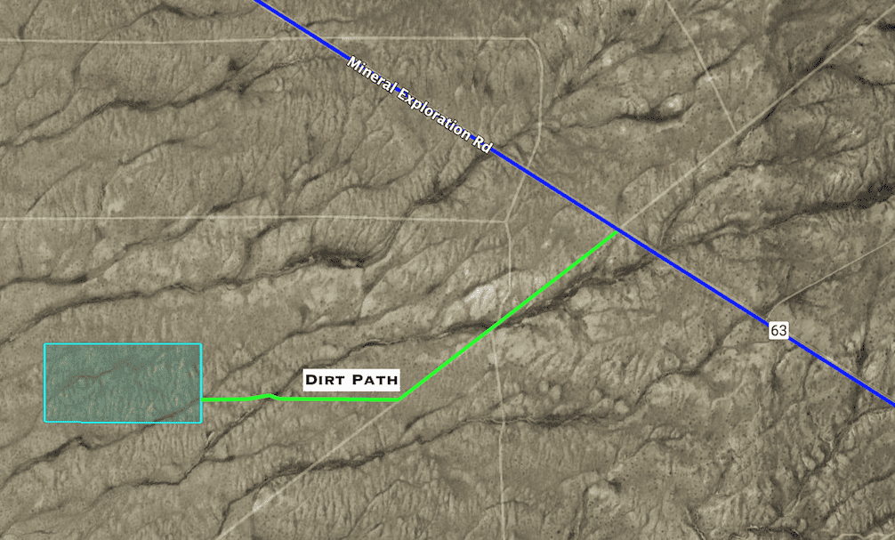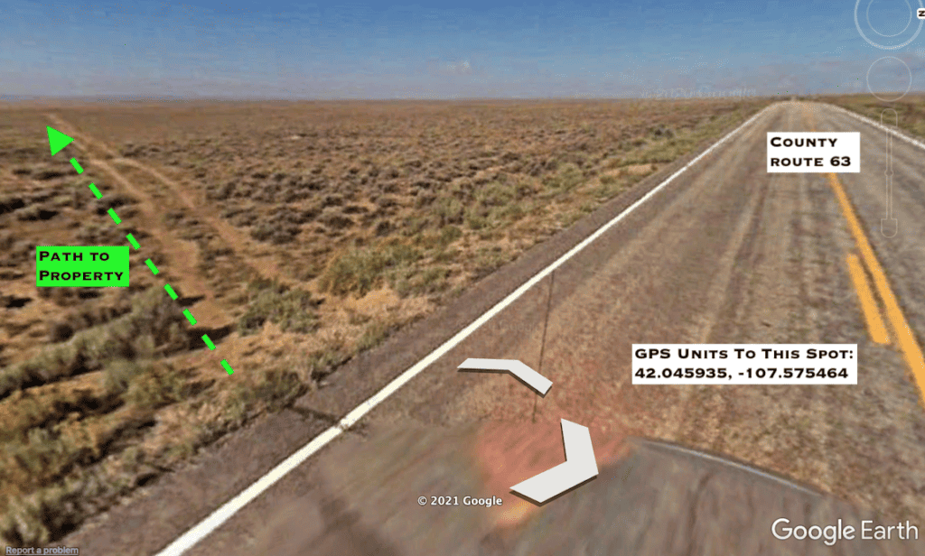 From Rawlins, take US 287 north for 15 miles. Turn left onto County Road 63 (Mineral Access Rd / Oil Rd to Mines). In 13.0 miles there will be a cattlegrate and fenceline. Turn left to follow the dirt path along the fenceline southwest. In 1.8 miles make a sharp left onto a path and head east (if you get to the point where the path and fenceline bear to the left, you have gone too far). In 0.25 miles, the property will be on your right-hand side.